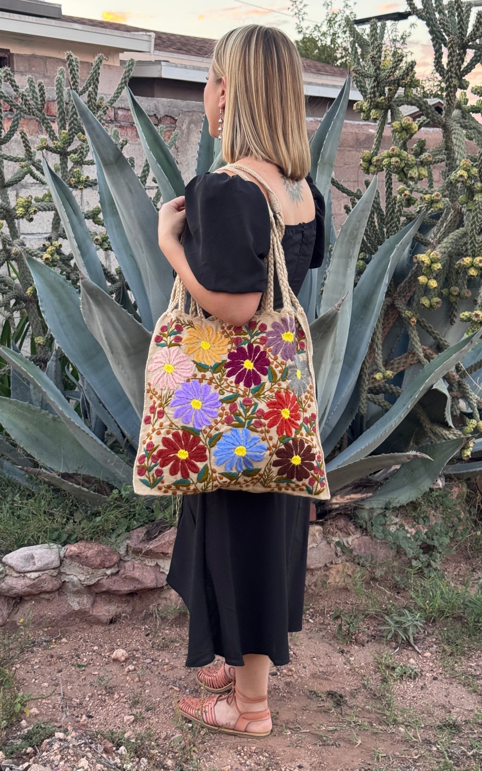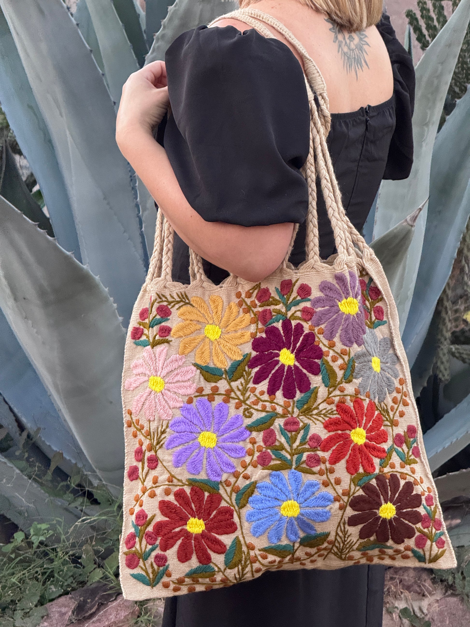 Handcrafted in Mexico, this beautiful tote is woven on a traditional waist loom and decorated with colorful hand-embroidered flowers. Each piece is unique, showcasing the artistry and heritage of Mexican craftsmanship, perfect for adding a touch of culture and color to your everyday style.