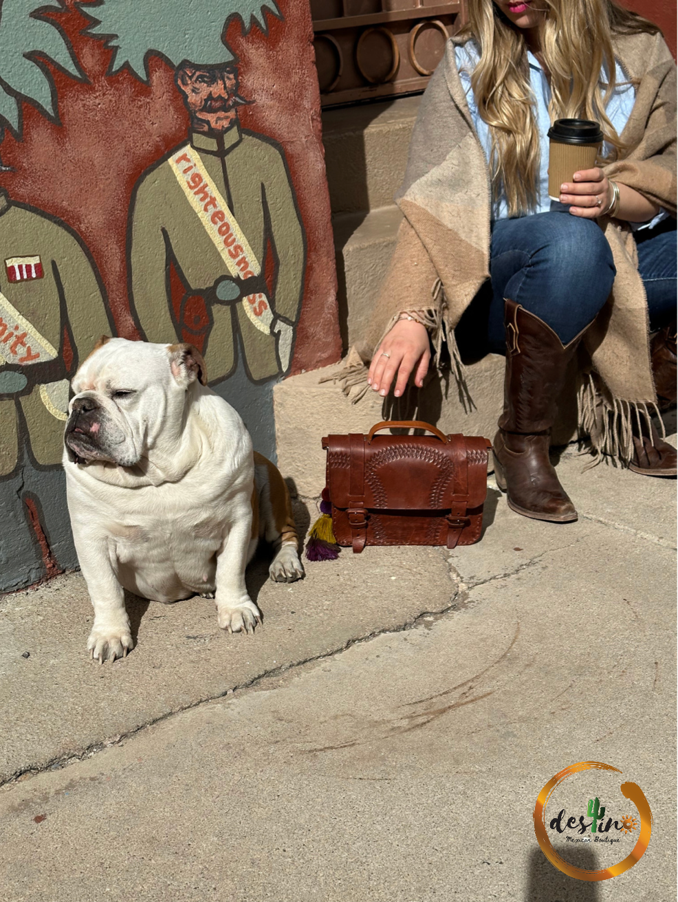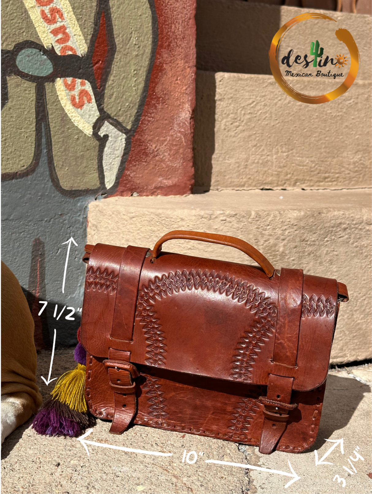 Genuine Mexican leather satchel purse designed and made by the Sanchez family in San Cristobal de las Casas, Chiapas, México. The Sanchez family has been in the leather industry for over 30 years.