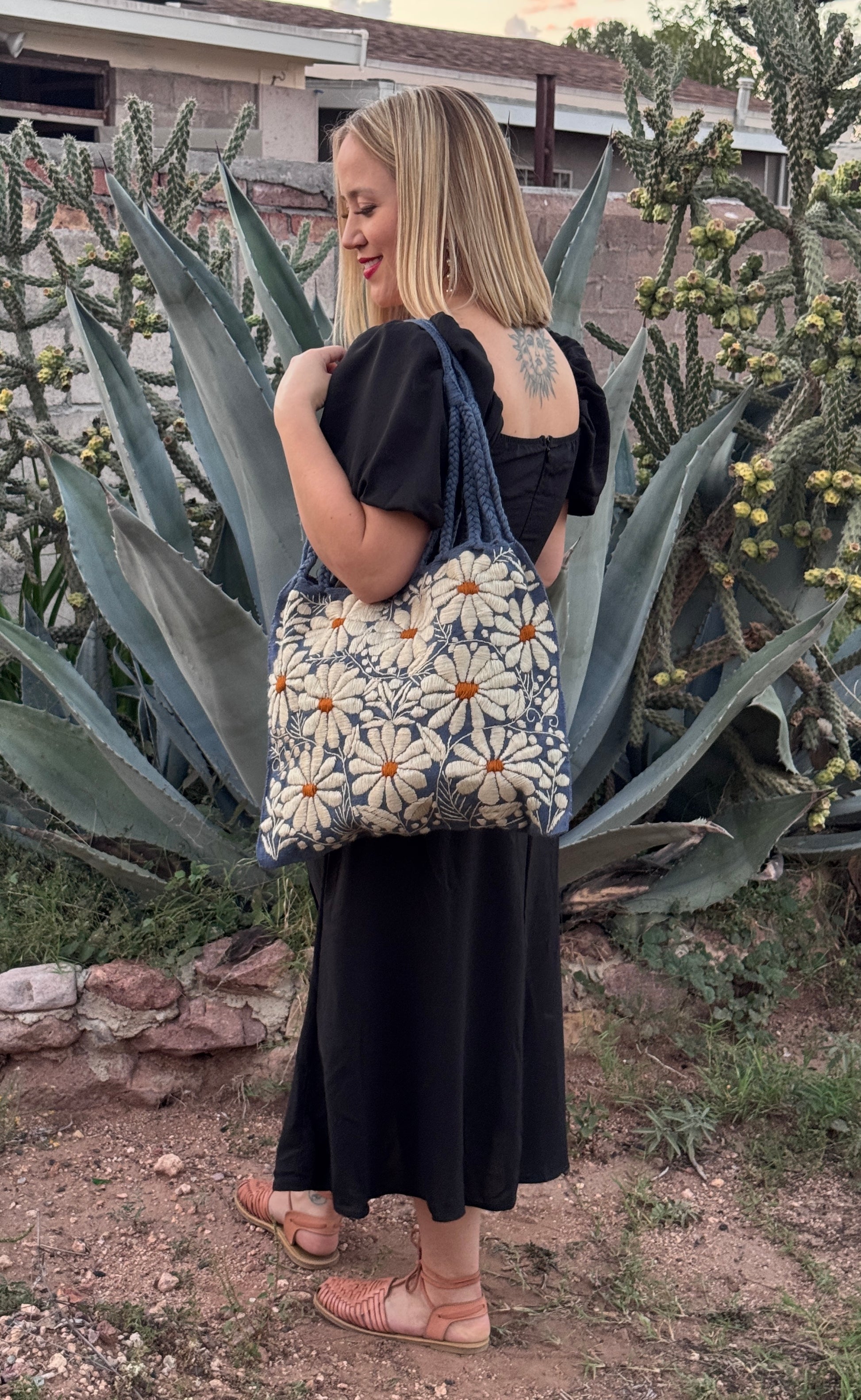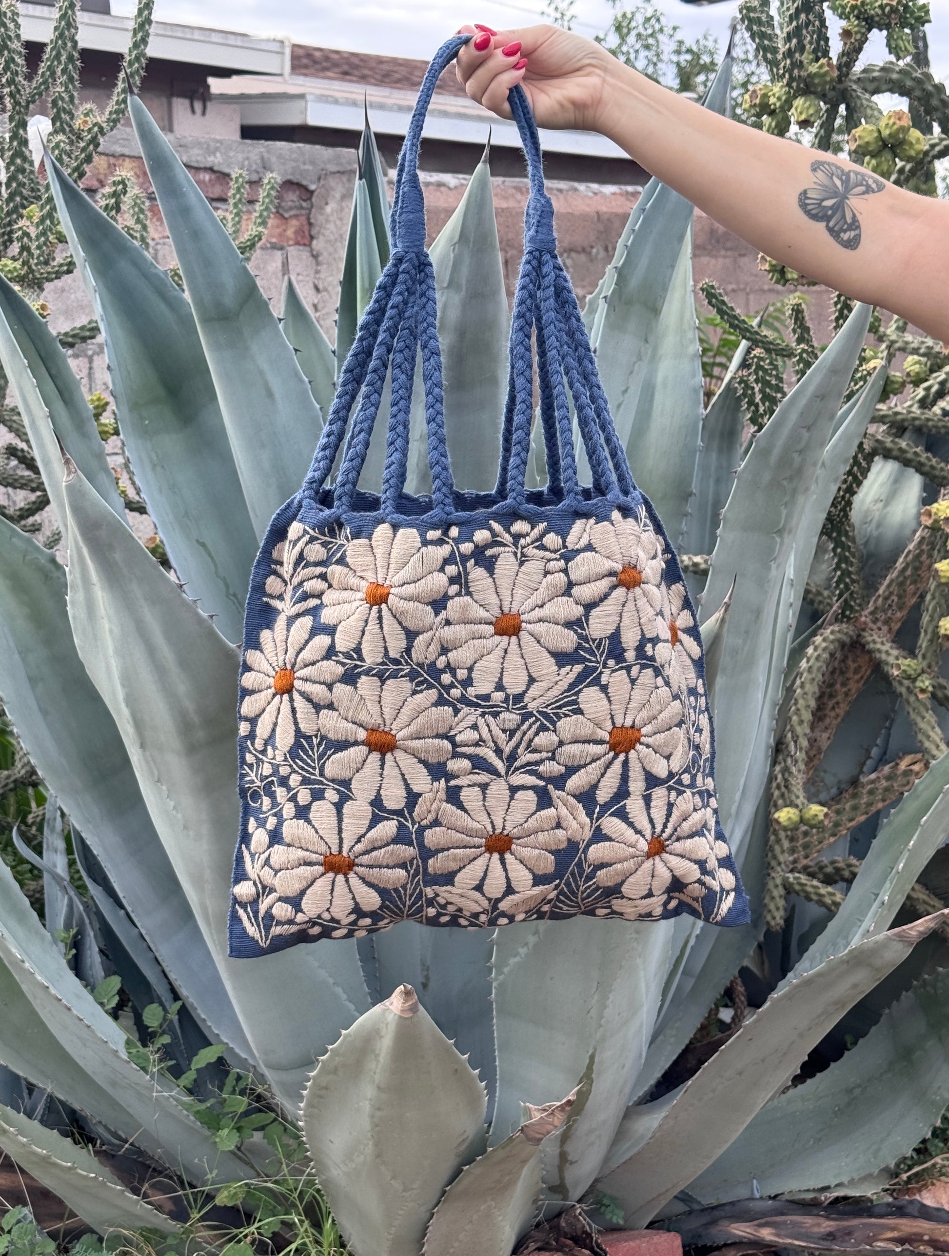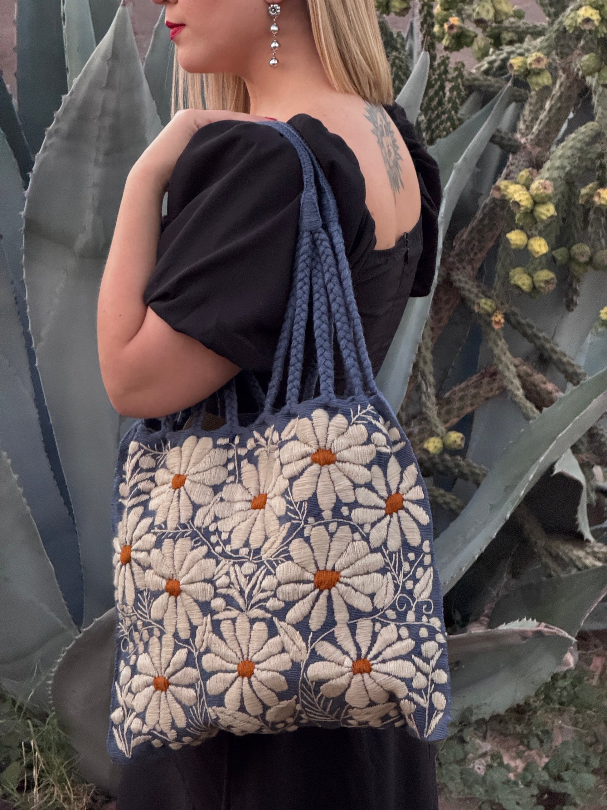 Handcrafted in Mexico, this beautiful tote is woven on a traditional waist loom and decorated with colorful hand-embroidered flowers. Each piece is unique, showcasing the artistry and heritage of Mexican craftsmanship, perfect for adding a touch of culture and color to your everyday style.