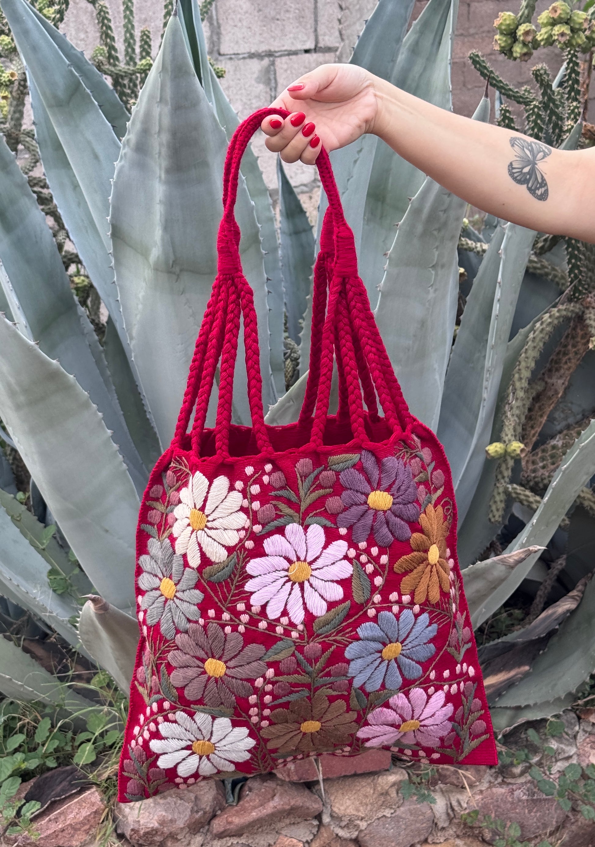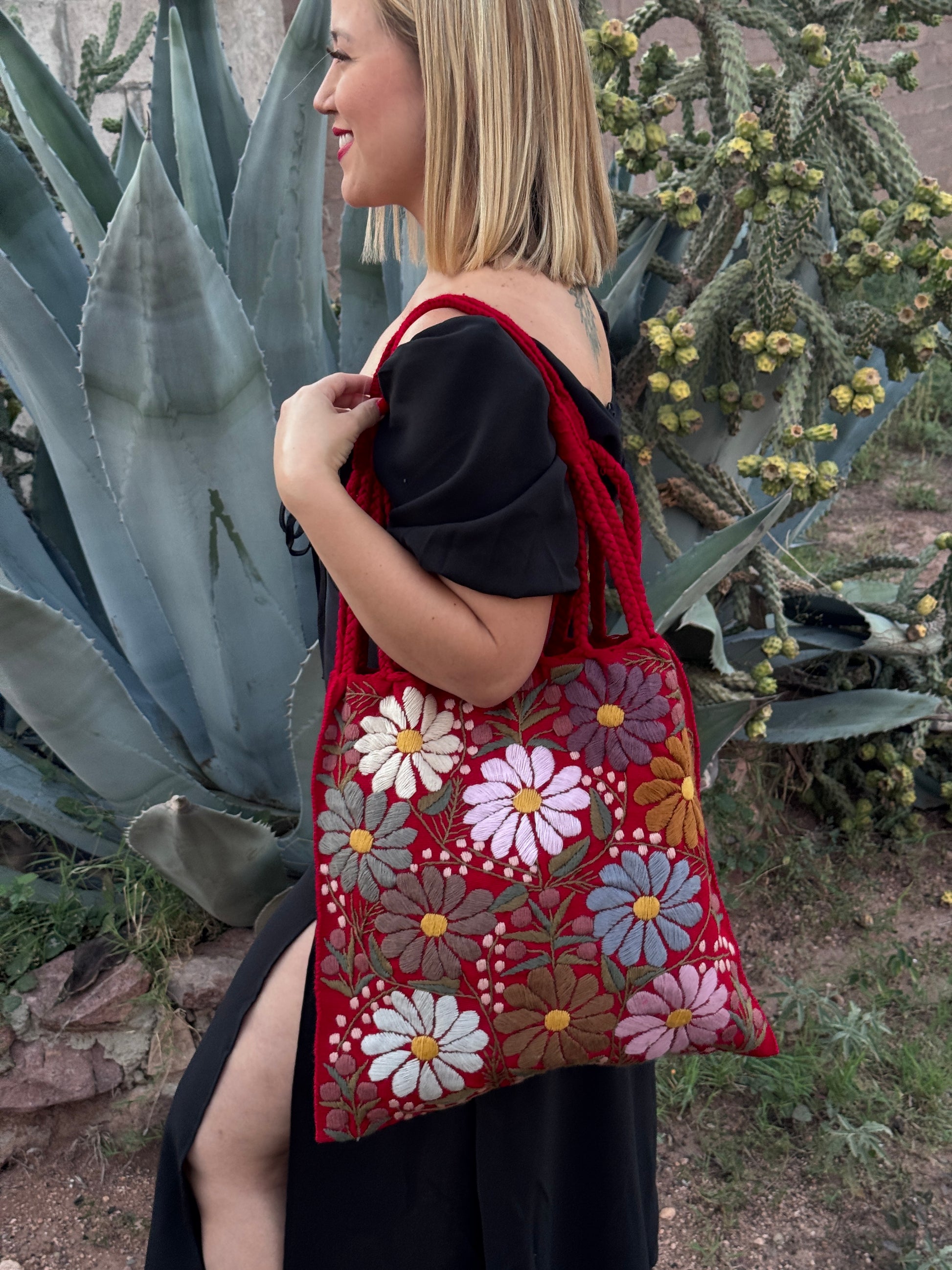 Handcrafted in Mexico, this beautiful tote is woven on a traditional waist loom and decorated with colorful hand-embroidered flowers. Each piece is unique, showcasing the artistry and heritage of Mexican craftsmanship, perfect for adding a touch of culture and color to your everyday style.