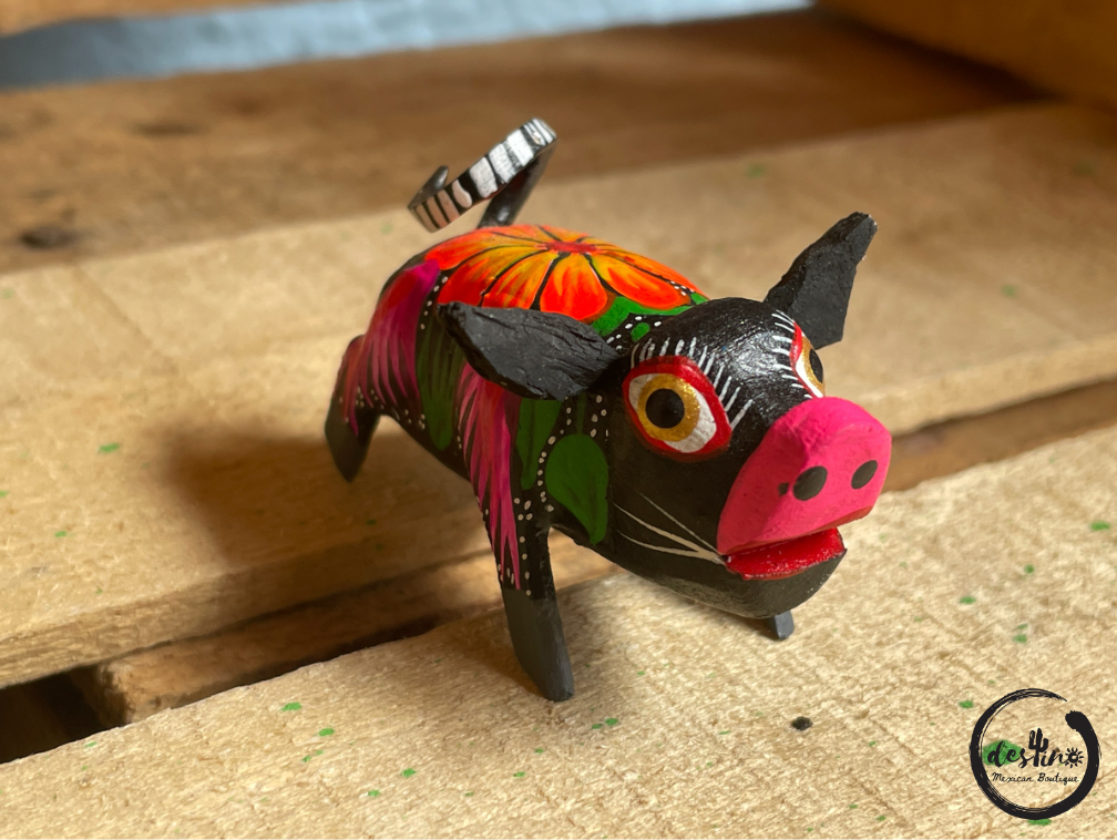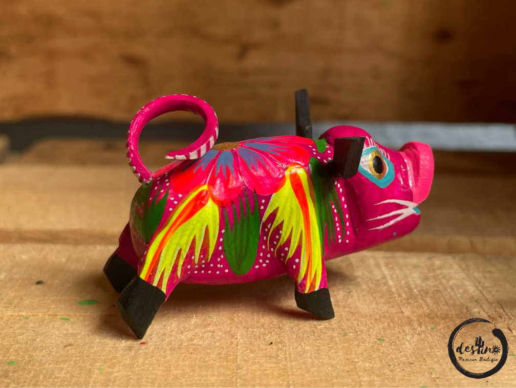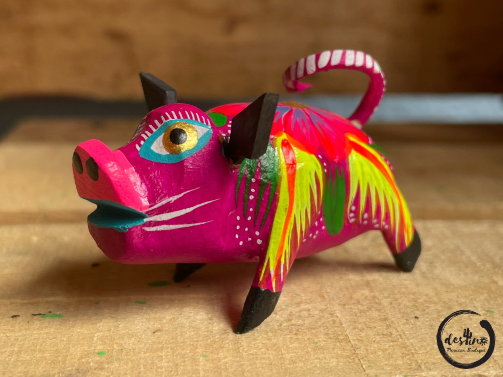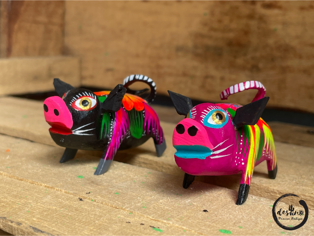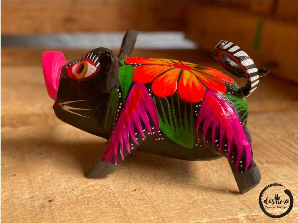 One of a kind hand carved wooden figures done by Mexican Artisans. All alebrijes are hand carved using copal wood which is the region’s natural resource. Each piece is polished and hand painted with acrylic paint by the Melchor family in Oaxaca de Juárez, Oaxaca, México.