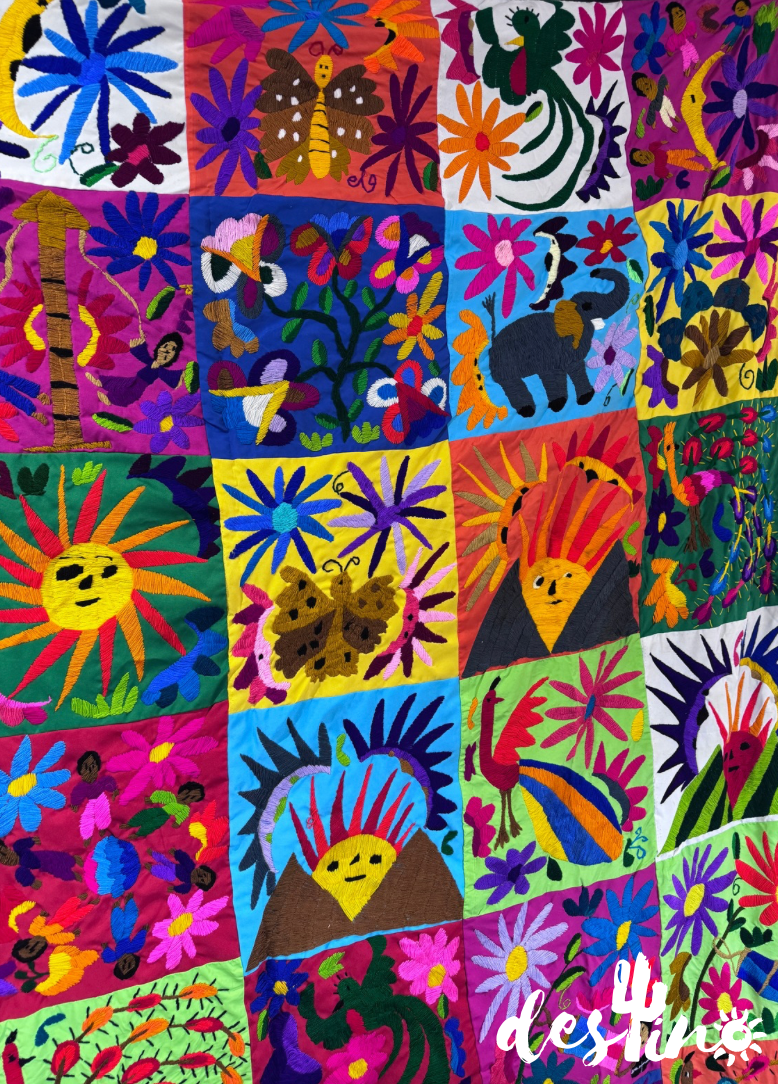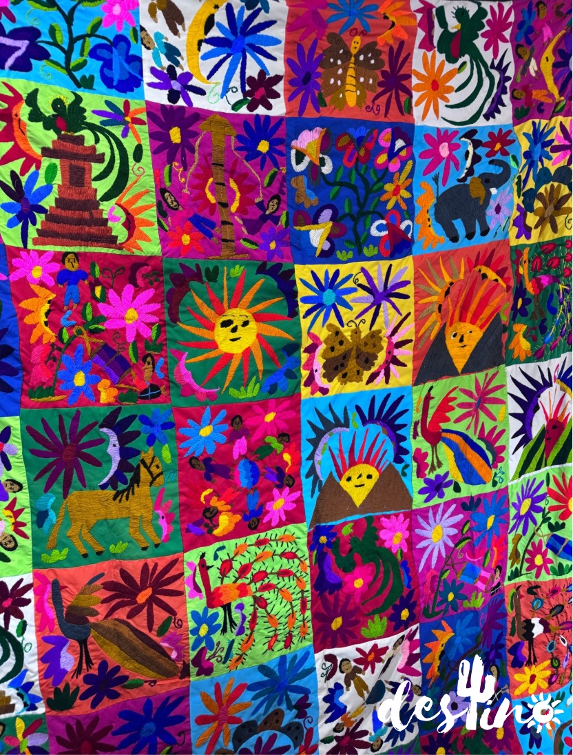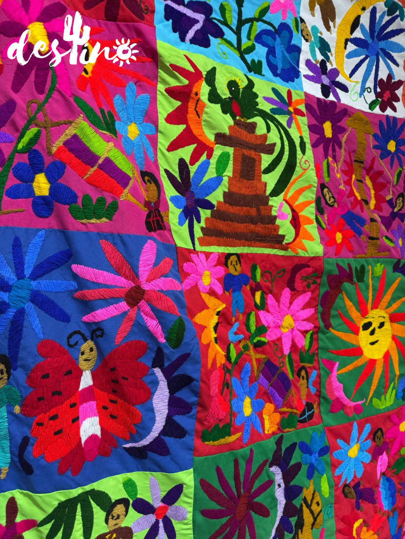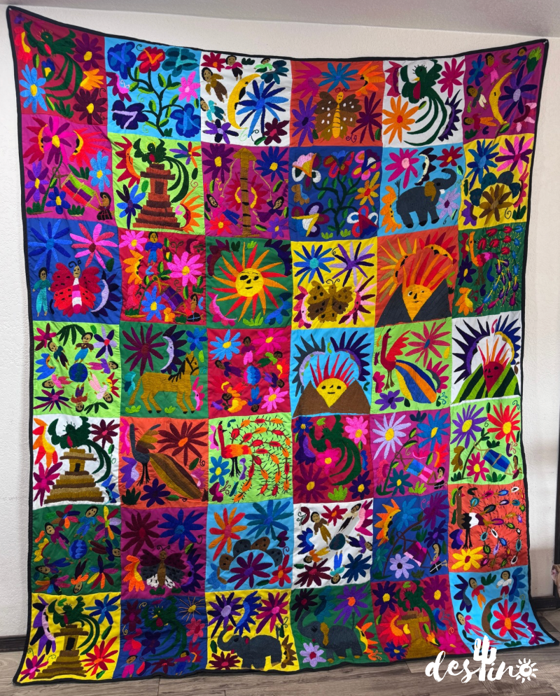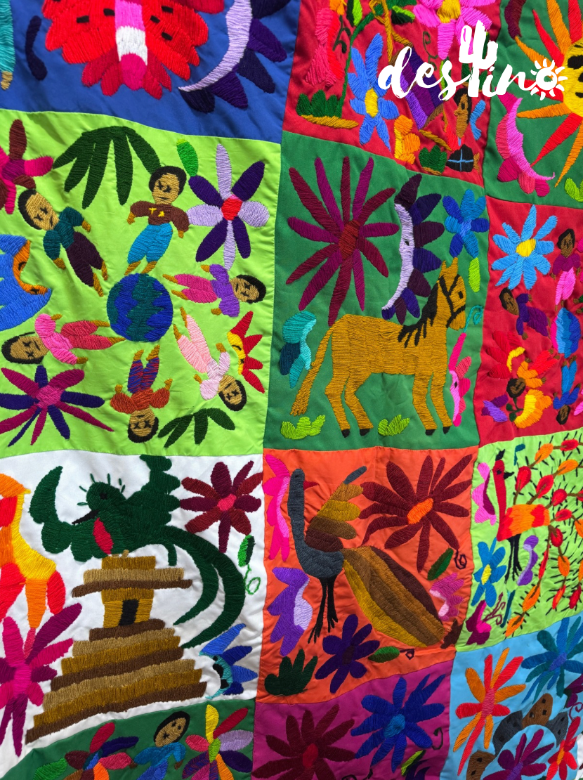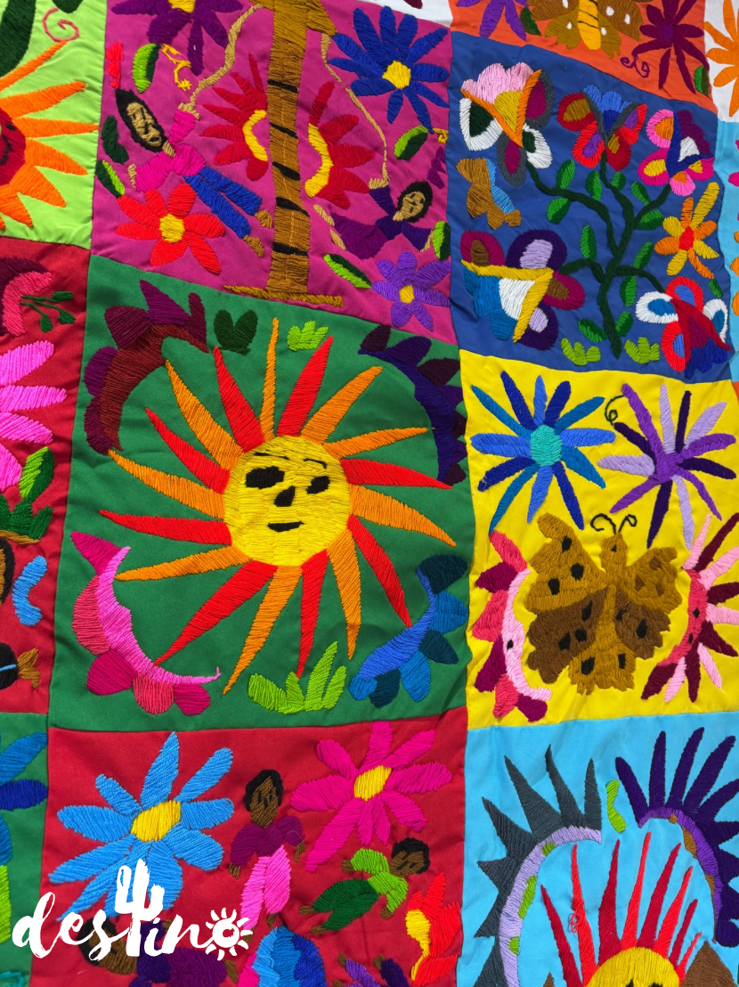 A Cultural Masterpiece; this hand-embroidered quilt is a vibrant piece of Mexican art and cultural heritage. A handmade collaboration by women artisans in Chichicastenango, Guatemala, and Chiapas, Mexico, it features the traditional stitchwort pattern, where every square carries a hidden message. Each quilt takes over five months to complete, making it a rare treasure for those who appreciate authentic, culturally rich craftsmanship.