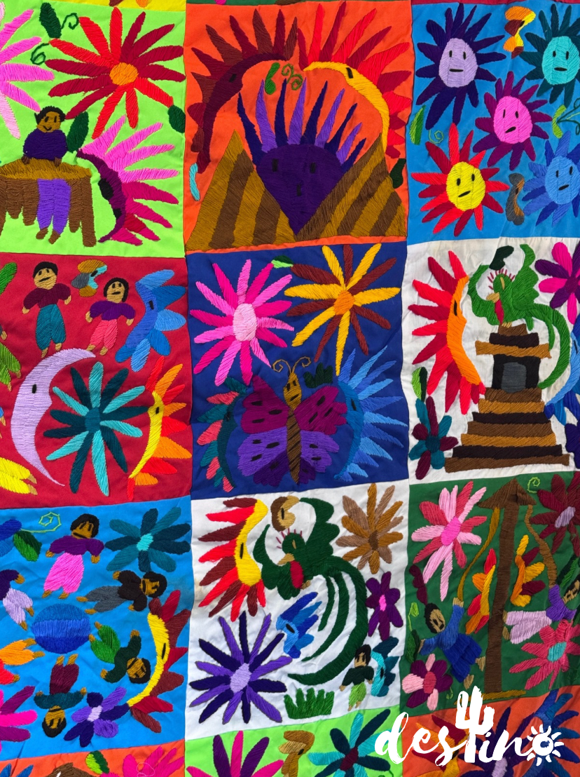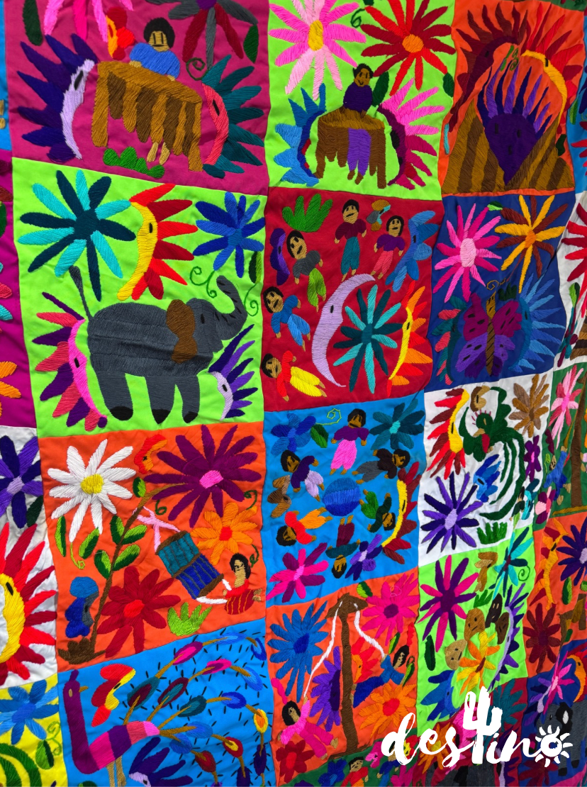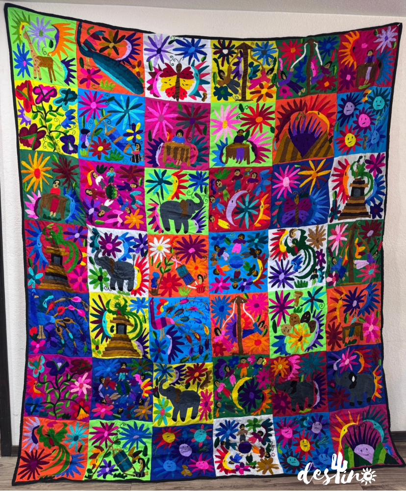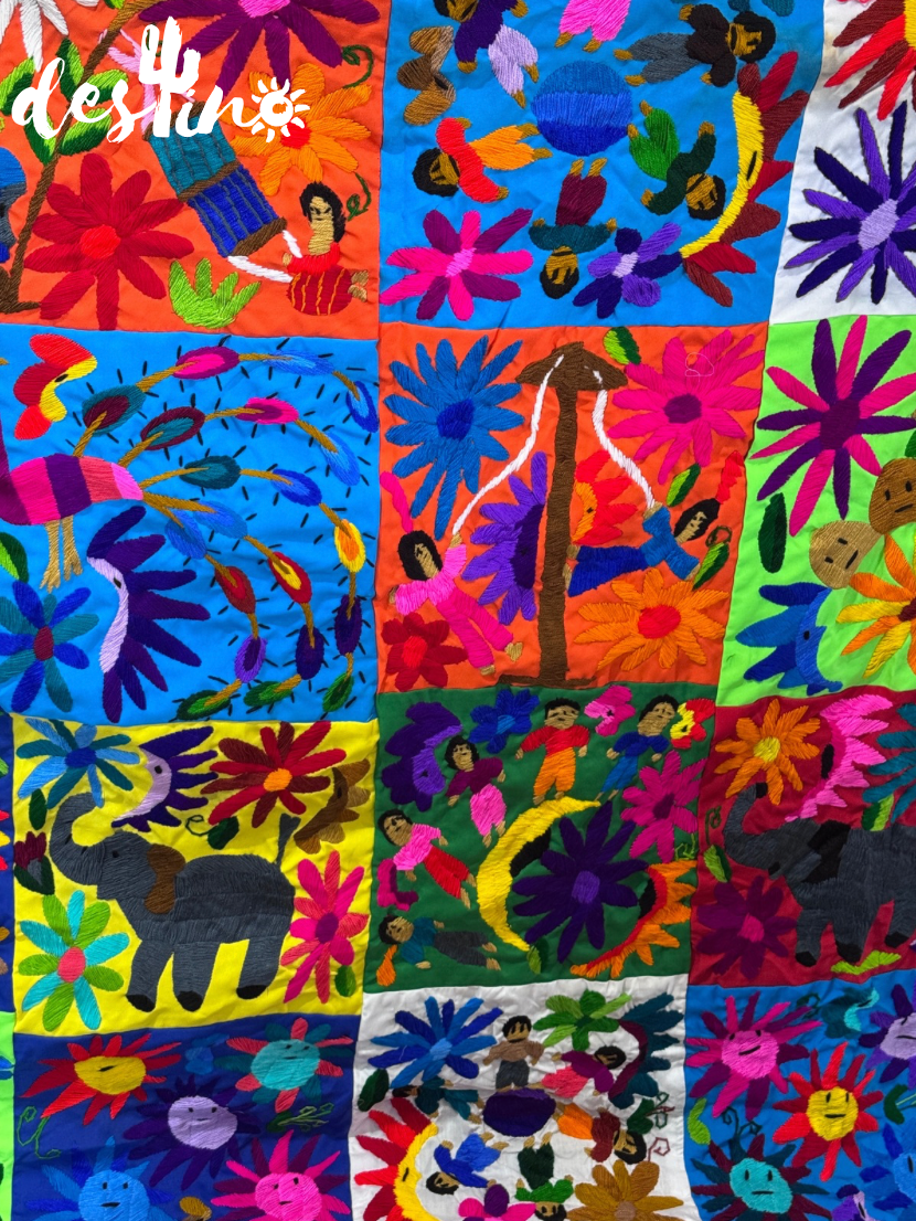 A Cultural Masterpiece; this hand-embroidered quilt is a vibrant piece of Mexican art and cultural heritage. A handmade collaboration by women artisans in Chichicastenango, Guatemala, and Chiapas, Mexico, it features the traditional stitchwort pattern, where every square carries a hidden message. Each quilt takes over five months to complete, making it a rare treasure for those who appreciate authentic, culturally rich craftsmanship.