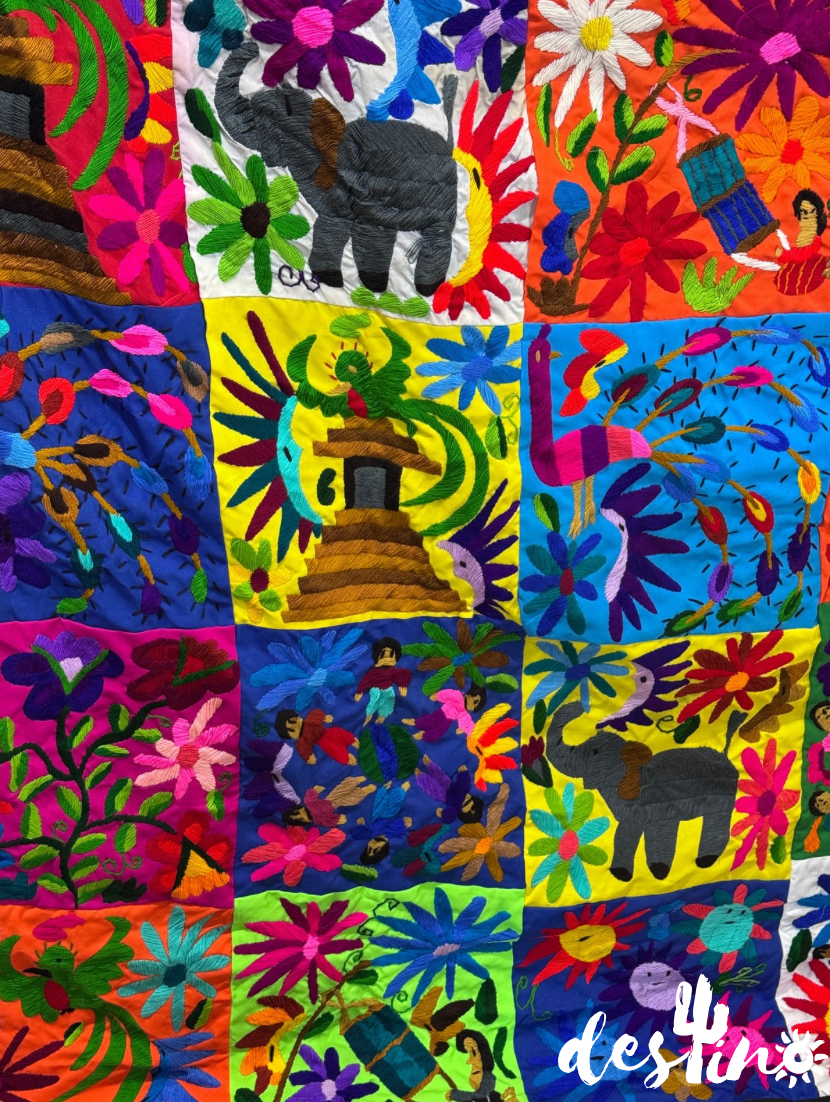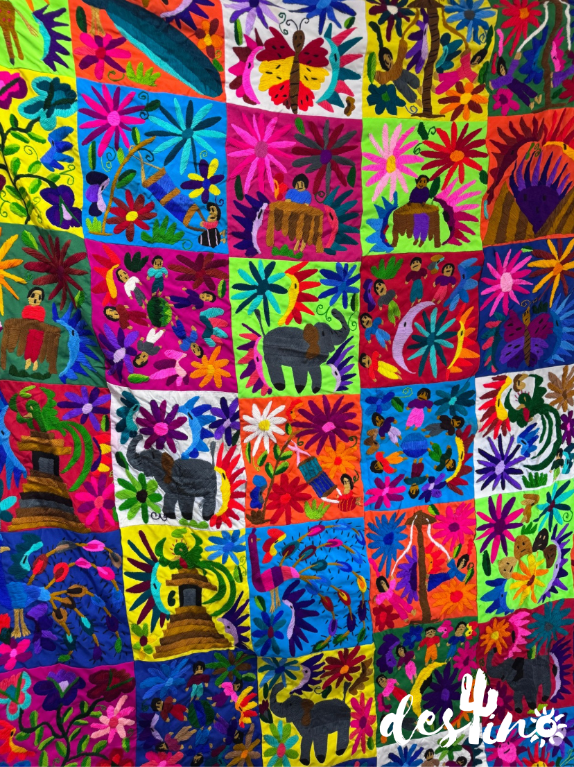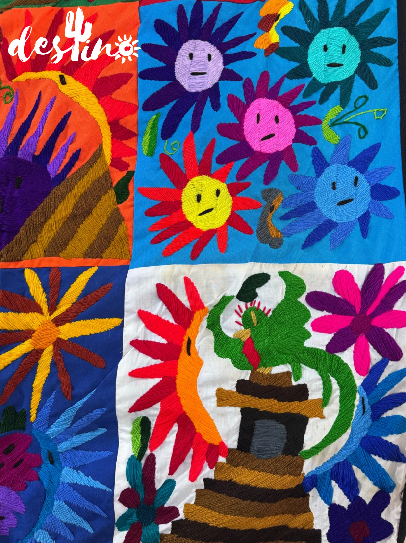 A Cultural Masterpiece; this hand-embroidered quilt is a vibrant piece of Mexican art and cultural heritage. A handmade collaboration by women artisans in Chichicastenango, Guatemala, and Chiapas, Mexico, it features the traditional stitchwort pattern, where every square carries a hidden message. Each quilt takes over five months to complete, making it a rare treasure for those who appreciate authentic, culturally rich craftsmanship.