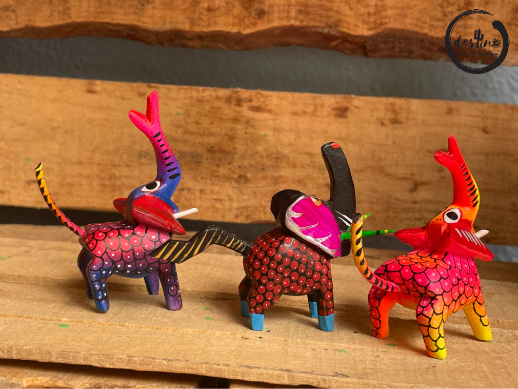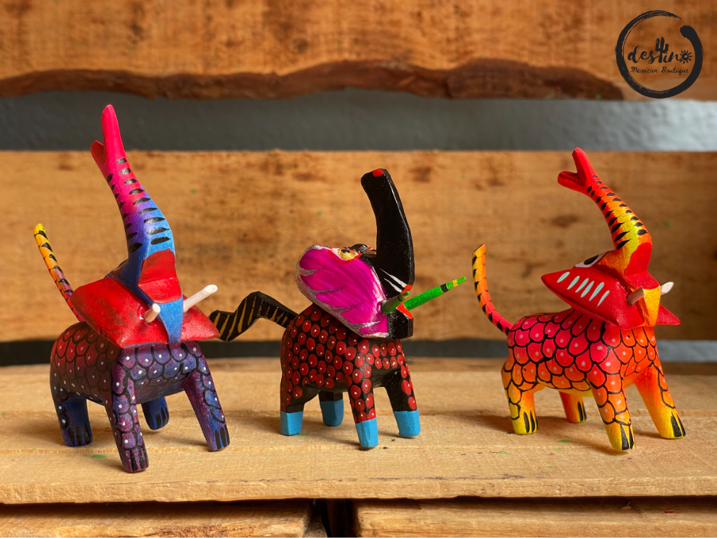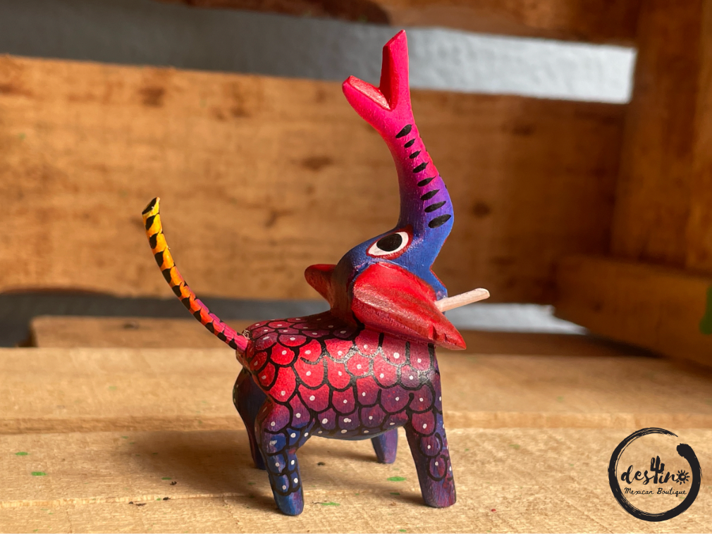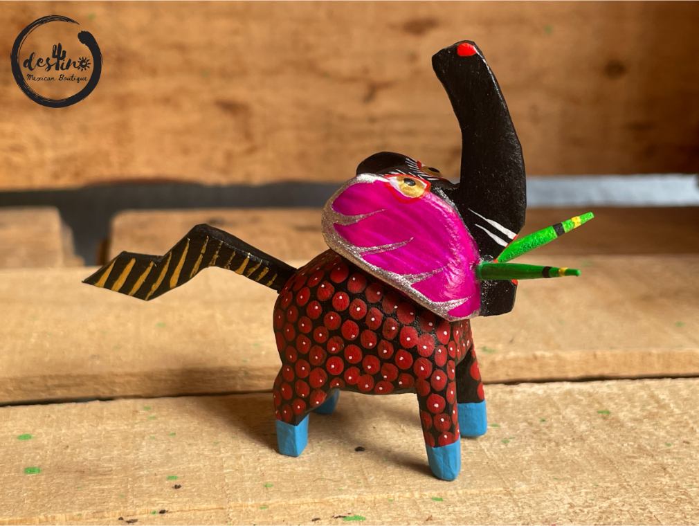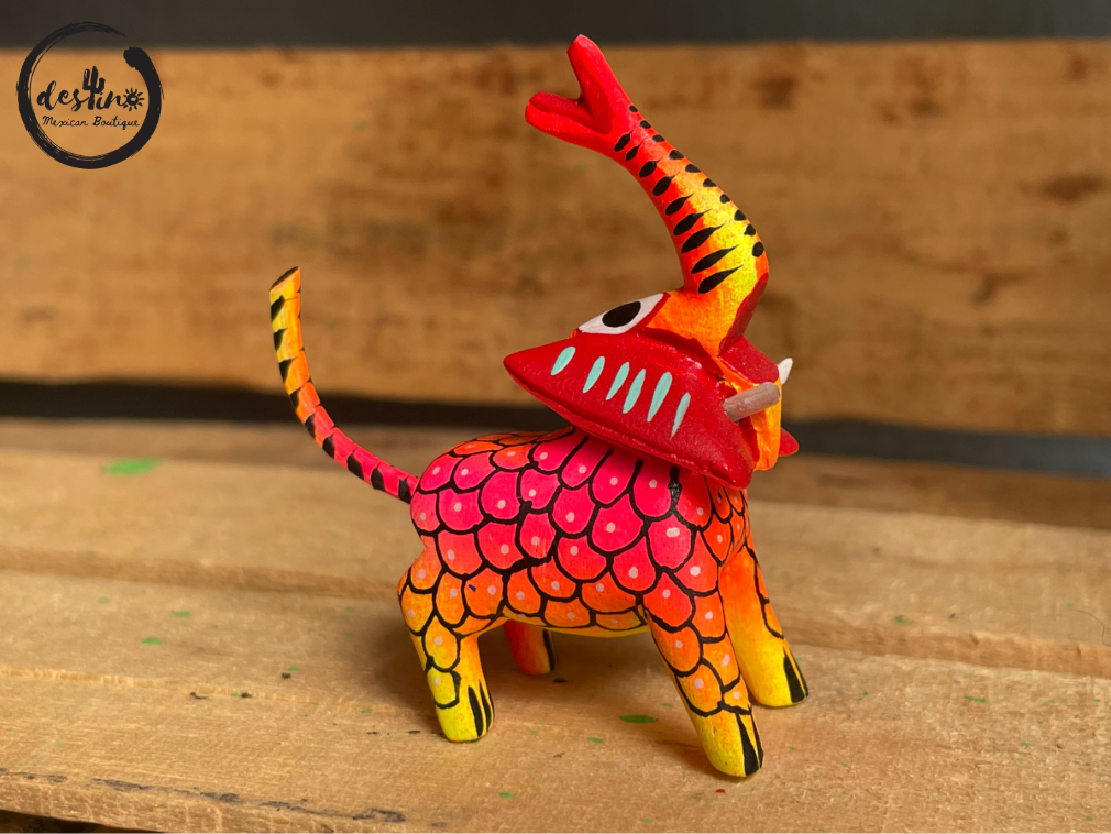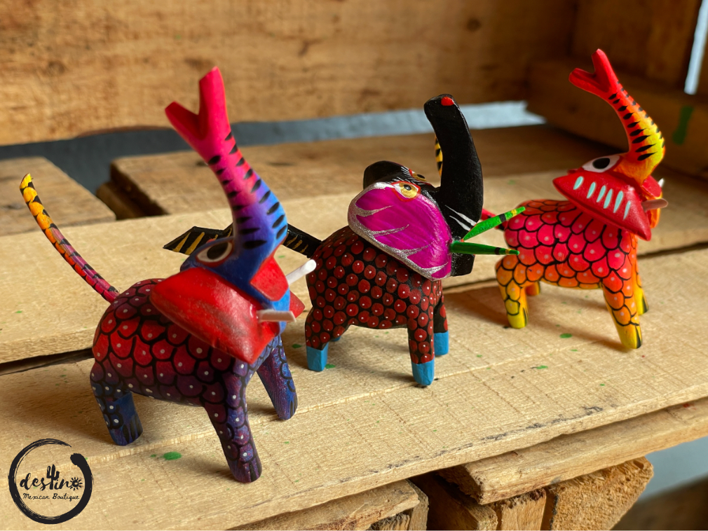 One of a kind hand carved wooden figures done by Mexican Artisans. All alebrijes are hand carved using copal wood which is the region’s natural resource. Each piece is polished and hand painted with acrylic paint by the Melchor family in Oaxaca de Juárez, Oaxaca, México.