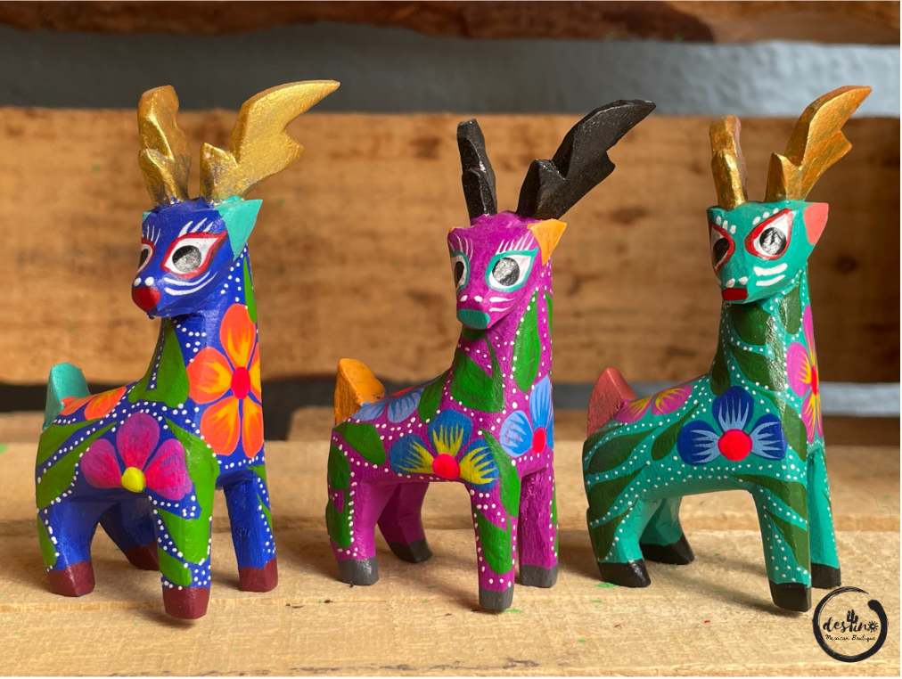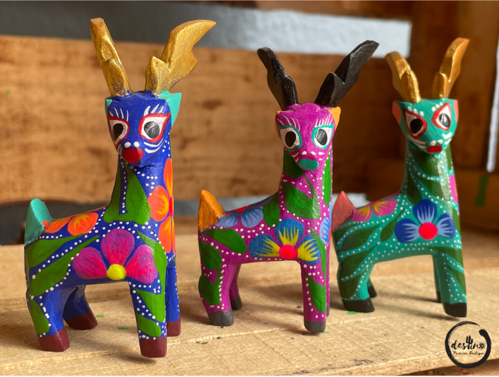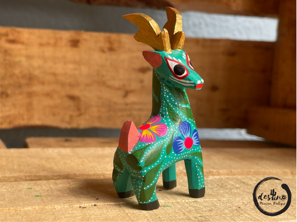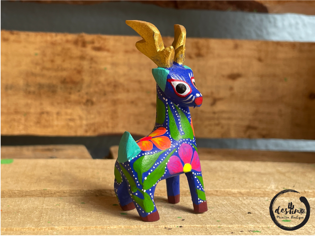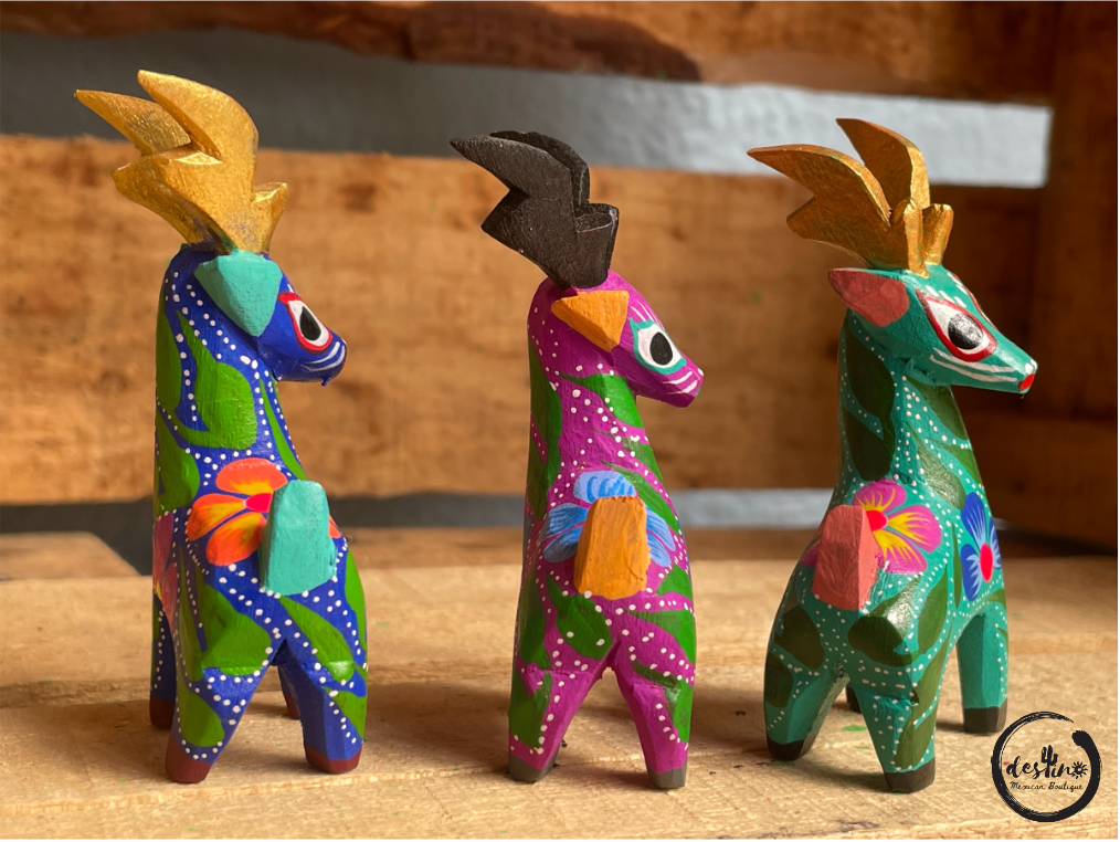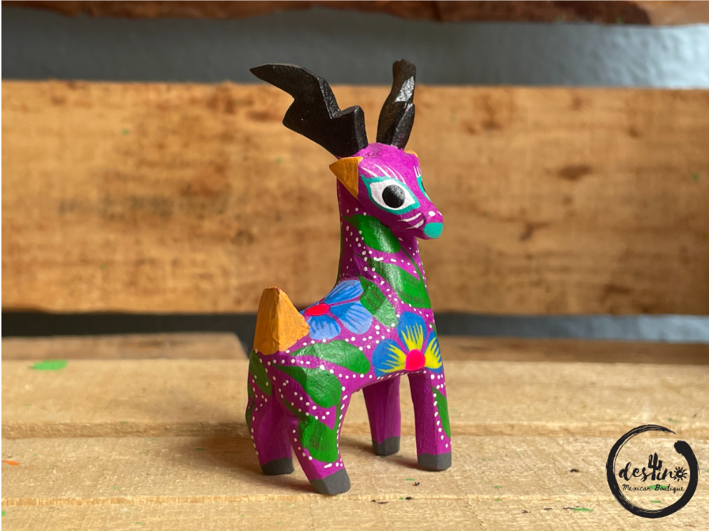 One of a kind hand carved wooden figures done by Mexican Artisans. All alebrijes are hand carved using copal wood which is the region’s natural resource. Each piece is polished and hand painted with acrylic paint by the Melchor family in Oaxaca de Juárez, Oaxaca, México.