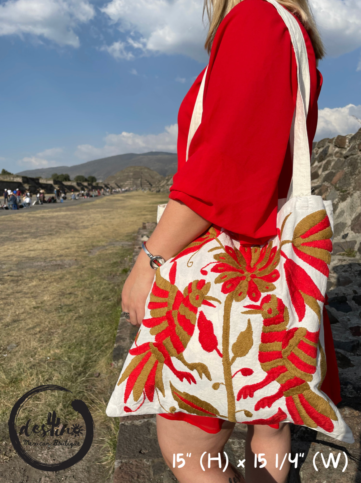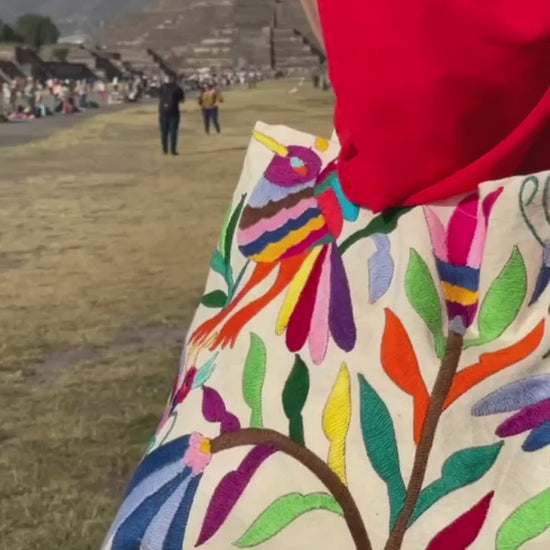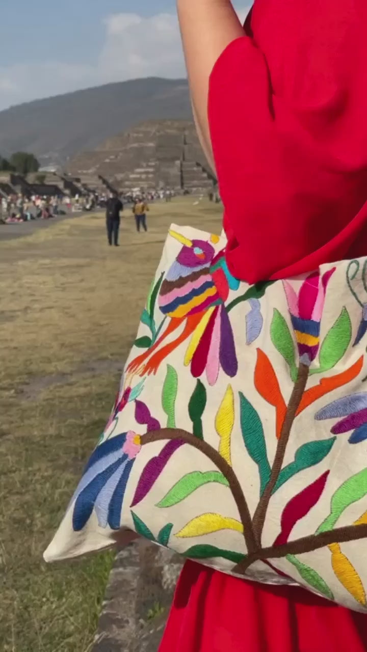 Modern Otomi tote, hand embroidered patterns inspired by Mexican rainforests. Each tote has a unique design made by Luz Maria in Tenango de Doria, Hidalgo, México.